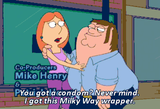 You got a condom? Never mind. I got this Milky Way wrapper.