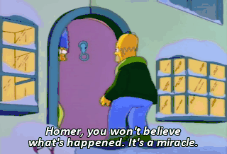 Homer, you won't believe what's happened. It's a miracle. Aw, Marge, I don't wanna hear any more about that silver polish.