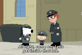 All right, come on. Let's get inside that lab. Hey, guys! Hitler! Hitler! How's it going, Mr. Hitler? It's a dog-eat-dog Reich, and I'm wearing bacon pants.