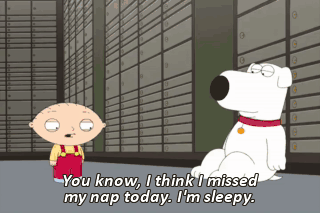 You know, I think I missed my nap today. I'm sleepy. Well, why don't you lie down? I think I will. (SIGHS) Brian? What? I just realized something. What? Tomorrow's Sunday.