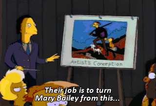 Their job is to turn Mary Bailey from this... into this. Ah, visual aids help so much. Thank you. But first, there's a burning issue that we need to address...