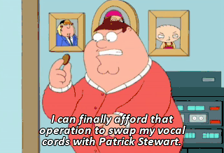 I can finally afford that operation to swap my vocal cords with Patrick Stewart. (IN PATRICK STEWART'S VOICE) Hey, Lois. Sorry about the mess in the upstairs bathroom this morning.