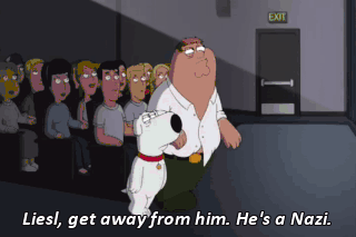 Liesl, get away from him. He's a Nazi. I know Jews is bad, but thems is worse. WOMAN: Sit down! MAN: Move. Stop blocking the screen, you jerk!