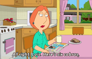 All right, Lois. Here's six cobras, a bolt of silk, and a ram's horn. Peter, what the hell? Hey, can you help me with the 20 paper bags of dates I got in the car? Why the hell would you get 20 bags of dates?