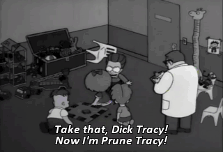 Take that, Dick Tracy! Now I'm Prune Tracy! Take that, Dick-- Ned, stop it at once! Stop it! I can't believe I was such a terror.