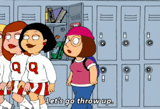 Let's go throw up. - Sure! - Good idea! Hey, I love throwing up. Hi. I'm Jennifer. Uh, I'm Meg. Oh My God. Your hair is so beautiful. I just want to brush it. Really? You want to go throw up?