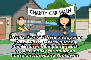 Thanks, Tom. I'm here on Spooner Street Where several quahog families are holding a car wash to raise money for an organ transplant for young Paul Lewis.