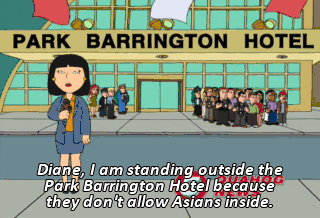 Diane, I am standing outside the Park Barrington Hotel because they don't allow Asians inside. Fancy place. Boy, that'd make some second honeymoon, huh?
