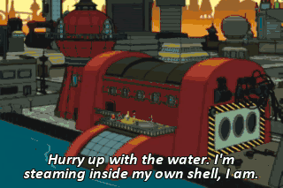 Hurry up with the water. I'm steaming inside my own shell, I am. It's that hot, it is!