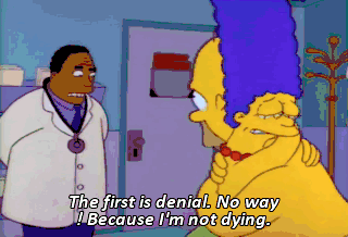The first is denial. No way ! Because I'm not dying. The second is anger. Why, you little-- And after that comes fear. What's after fear ? What's after fear ?