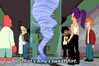 That's Amy's sweatshirt. And that's Bender's hat from the Players' Ball!