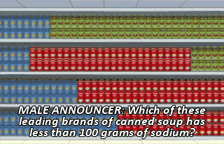 MALE ANNOUNCER: Which of these leading brands of canned soup has less than 100 grams of sodium?