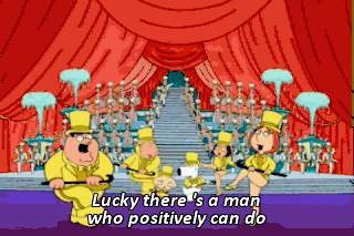 Lucky there 's a man who positively can do All the things that make us Laugh and cry He 's a family guy Peter, this game night was a great idea.