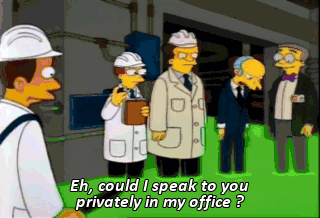 Eh, could I speak to you privately in my office ? Mr. Burns, in 20 years, I have never seen such a shoddy, deplorable-- Oh, look.