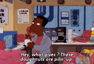Hey, what gives ? These doughnuts are pilin' up. Heh. Yeah, Homer Simpson went on a diet.