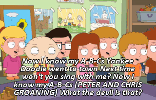 Now I know my A-B-Cs Yankee Doodle went to town Next time won't you sing with me? Now I know my A-B-Cs (PETER AND CHRIS GROANING) What the devil is that?