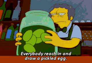 Everybody reach in and draw a pickled egg. Whoever gets the black egg stays sober tonight. - Whew! - Whew! Whew! Oh!