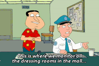 This is where we monitor all the dressing rooms in the mall... so we can keep an eye out for shoplifters. You don't say. Oh, my God! That one's having a heart attack!