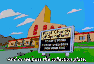 And as we pass the collection plate, please give as though the person next to you were watching. Oh, man. This is the hottest Easter ever. Even that praying mantis is losing it. Thank you, Helen.