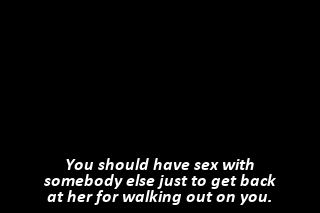 You should have sex with somebody else just to get back at her for walking out on you. Just have sex with somebody.
