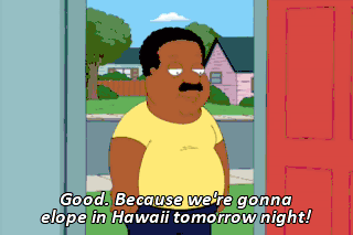 Good. Because we're gonna elope in Hawaii tomorrow night! What? You got a problem with that, you can go fuck yourself. Loretta? Hello, Cleveland. What are you doing here?