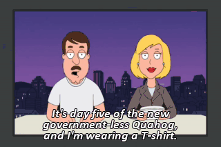 It's day five of the new government-less Quahog, and I'm wearing a T-shirt.