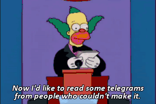 Now I'd like to read some telegrams from people who couldn't make it. First we have Mark Spitz. Who's Mark Spitz? What's a telegram? Aw, forget it! I gotta get to the hot wings before the Comic Book Guy.