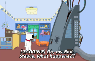(GAGGING) Oh, my God, Stewie, what happened? None of your fucking business what happened! Geez, you kiss your mother with that mouth?