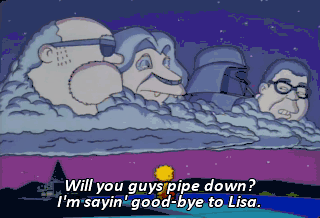 Will you guys pipe down? I'm sayin' good-bye to Lisa. We're sorry. I don't want you to go. Sorry, but I have to. Good-bye.