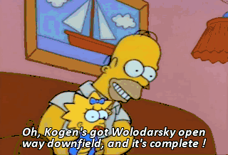 Oh, Kogen's got Wolodarsky open way downfield, and it's complete !