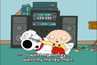 I want my money. I want my money, man. Stewie, listen, this is crazy. You got... Oh, my God. (SCREAMING) All right, let's go to the bank.