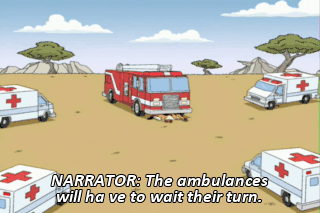 NARRATOR: The ambulances will ha ve to wait their turn.