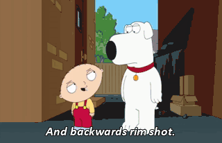 And backwards rim shot. (RIM SHOT IN REVERSE) Brian, this is gonna be more difficult than I thought. Damn it, I hate these new stairs! Fuck! Fucking cock! Fuck! Cock! Cock!