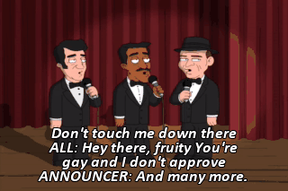 Don't touch me down there ALL: Hey there, fruity You're gay and I don't approve ANNOUNCER: And many more.