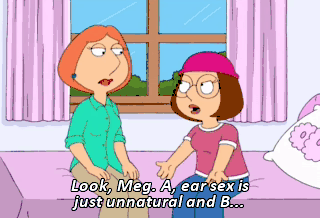 Look, Meg. A, ear sex is just unnatural and B... How do I say this? Vaginal intercourse is... It's just tops. It's the bee's knees, Meg. Oh, when you rattle it around just right. Oh, my God! I mean...