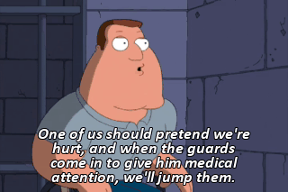 One of us should pretend we're hurt, and when the guards come in to give him medical attention, we'll jump them. That's perfect, Joe.