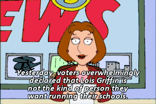 Yesterday, voters overwhelmingly declared that Lois Griffin is not the kind of person they want running their schools.