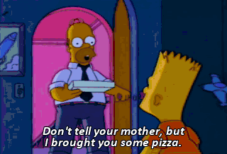 Don't tell your mother, but I brought you some pizza. just promise me you'll try to be good. - I promise. - That-a-boy. Sucker.
