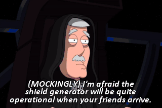 (MOCKINGLY) I'm afraid the shield generator will be quite operational when your friends arrive. Jeez, you don't have to be a dick about it.