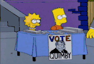 Hey, four-eyes, vote Quimby. Hey, beard-o, vote Quimby. This time he's the lesser of two evils. Uh, yeah, yeah. I love "Grimby."