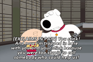 (EXCLAIMS IN PAIN) You stink! And now I'm trapped in here with you and your stink because you were too stupid to call somebody who could help us!