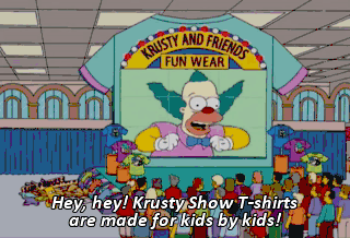 Hey, hey! Krusty Show T-shirts are made for kids by kids! And we pass the "slavings" on to you! (CHUCKLING) We've got all your favorite characters, Itchy, Scratchy, Poochie, Austin Powers Itchy,