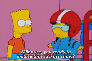 Milhouse, you ready to imitate that Jackass show? All those disclaimers made me wanna do it more. Oh, yeah