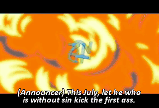 (Announcer) This July, let he who is without sin kick the first ass.