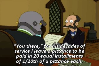 "You there," for his decades of service I leave a pittance to be paid in 20 equal installments of 1/20th of a pittance each.