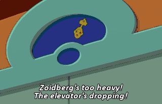 Zoidberg's too heavy! The elevator's dropping! Change of plan! We'll have to leave through the main exit! Everybody say "fresh shrimp!" (GROANS) That was a rough ride. (BELCHES) Uh-oh.