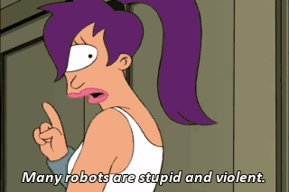 Many robots are stupid and violent. I wish I was stupid and violent. Then we'd see what's what. I'd pound him till I... oh! Get ye to your houses, ye ignorant villagers. Hey!