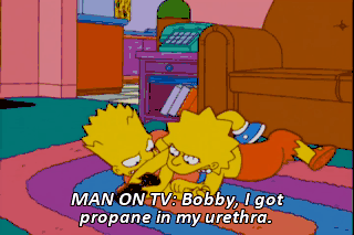 MAN ON TV: Bobby, I got propane in my urethra. ANNOUNCER 2 ON TV: We'll be right back with Who Will Marry a Million Bears!