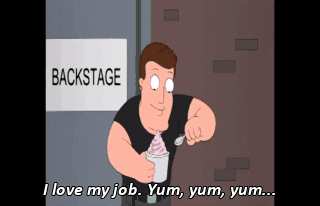 I love my job. Yum, yum, yum... Hey, there, cutie. Oh, hey. How's it going?