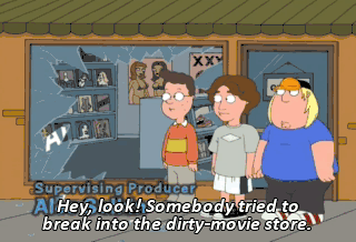 Hey, look! Somebody tried to break into the dirty-movie store. BOY: Quick! Grab as many as you can before someone sees us.